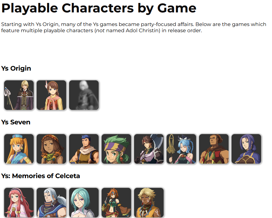 I’d also like to add more about lore (especially Romn) and give each game’s story a quick, collapsible summary. There is such a wealth of information out there in the Ys universe, and I want to catalogue it as best as possible.