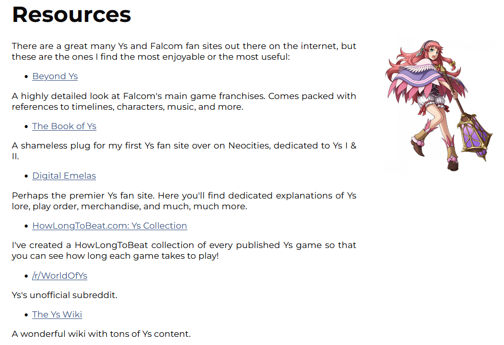 Part of making this website was to create something that was different than the normal Ys fan website. Between Digital Emelas, Beyond Ys, and the Ys Wiki, there’s already a lot of high quality, reliable content out there.